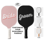 Personalize this bride and groom custom pickleball paddle with retro peach pink bride pickleball paddle and black groom pickleball paddle for a personalized wedding pickleball gift, bachelorette, bachelor, wedding party or for yourself - Official USA Pickleball Approved Pickleball Paddle. Choose from Fiberglass 10 mm or upgrade to Carbon Fiber 16 mm.